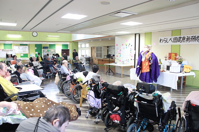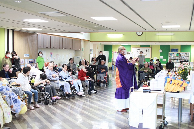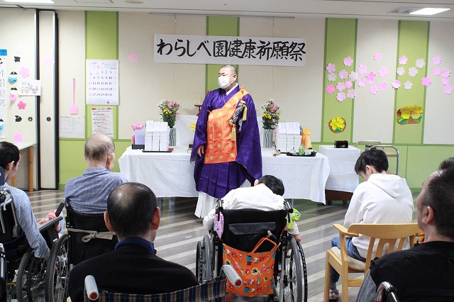 祈祷後に古田住職より、「健康」とは「健体康心」からつまり「体が健やかで心がやすらかな状態」である事を表す言葉で体が元気でも心が疲れていたらそれは健康ではない逆も同じで「体も心もベストな状態が健康」で、そのためには1日1回は笑顔で「ありがとう」と「挨拶」を伝えてください。そうすると一緒に過ごすあなた方も職員さんも健康に過ごすことができるのです。とお話を頂きました。