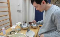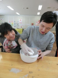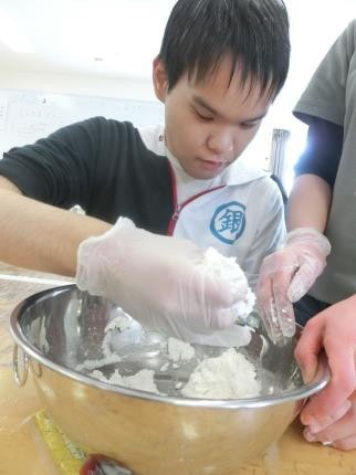白玉粉に水を加え、ヘラで混ぜたり手でこねたり、それぞれができる作業をしていただきました。