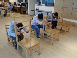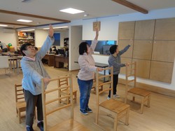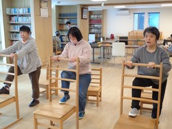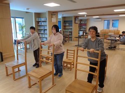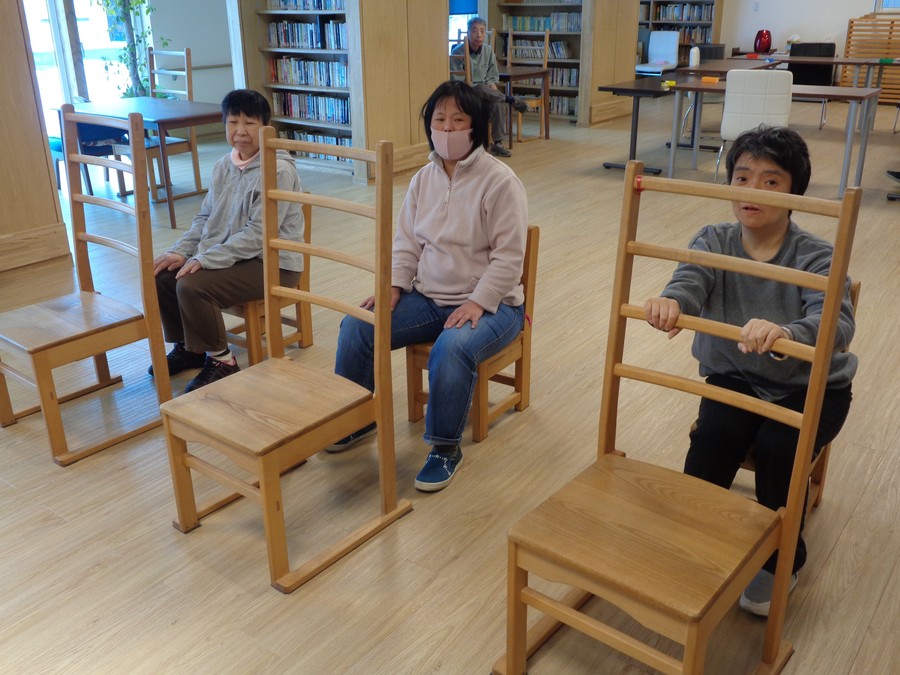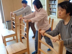 この椅子はコンダクティブ教育創設者ペトゥ・アンドラーシュ博士が考案した椅子です。木でできたシンプルな形ですが、背もたれ部は握りやすい太さの数本の桟(サン)になっています。もちろん家具としての椅子が原型ですが、運動障がいのある人の姿勢保持や姿勢変換などの学習にも用います。様々な生活場面で活用ができるよう設計されていますが、"椅子"という生活用具を用いていることが重要なポイントです。