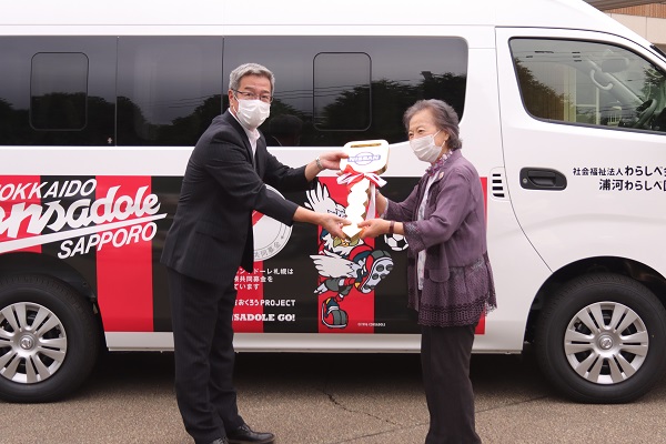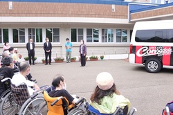 同日に納車式を行い、浦河町共同募金会小泉会長より上中施設長へ鍵の贈呈と