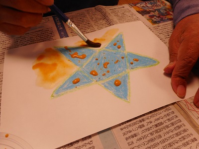 クレヨンで描いた部分が水彩絵の具を弾くことを利用した技法を使い、