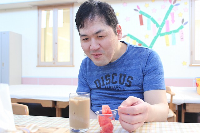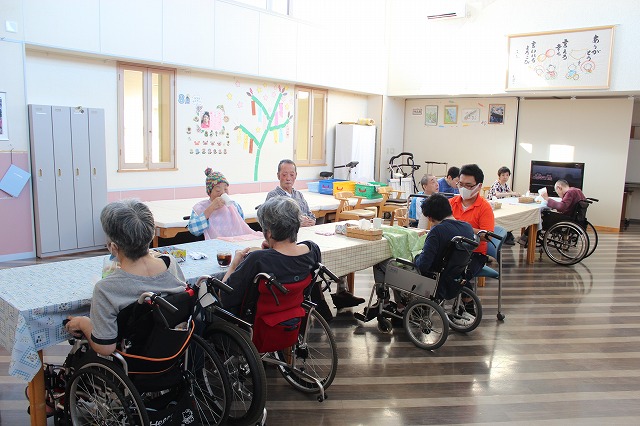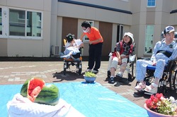 中庭の真ん中にドン!と置かれた大きなスイカに向け利用者の皆さんに準備した色んな棒で割ってもらいました(^^♪