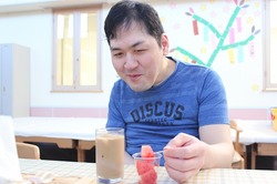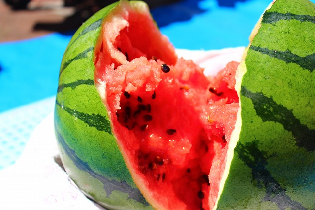 力いっぱい叩かれたスイカはきれいに割れておいしそうな赤い果肉が見えたところでお昼ごはんの時間になってしまいました( ;∀;)![]()
