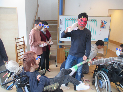 皆さん大喜びで豆とチョコレートを鬼目掛けて投じていました。